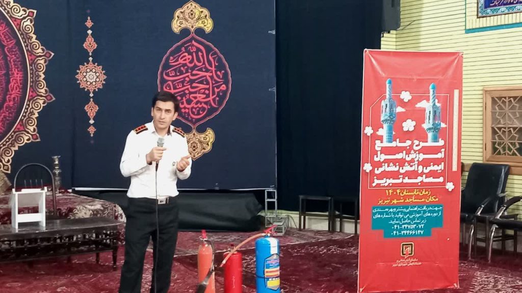 در راستای افزایش سطح ایمنی مساجد شهر تبریز به عنوان یکی از اماکن عمومی و پر رفت و آمد شهری طرح جامع آموزش اصول ایمنی و آتش نشانی مساجد با همکاری سازمان آتش نشانی تبریز در مسجد نبی اکرم (ص) با حضور کارشناسان و مدرسان این سازمان در جمع نمازگزاران و خادمان این مسجد برگزار شد.